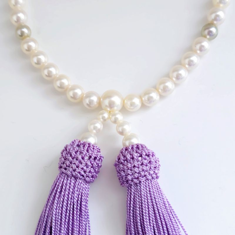 淡いピンクの光沢が美しい 国産アコヤ真珠 、すべて国産アコヤ真珠仕上げのこだわりの数珠。